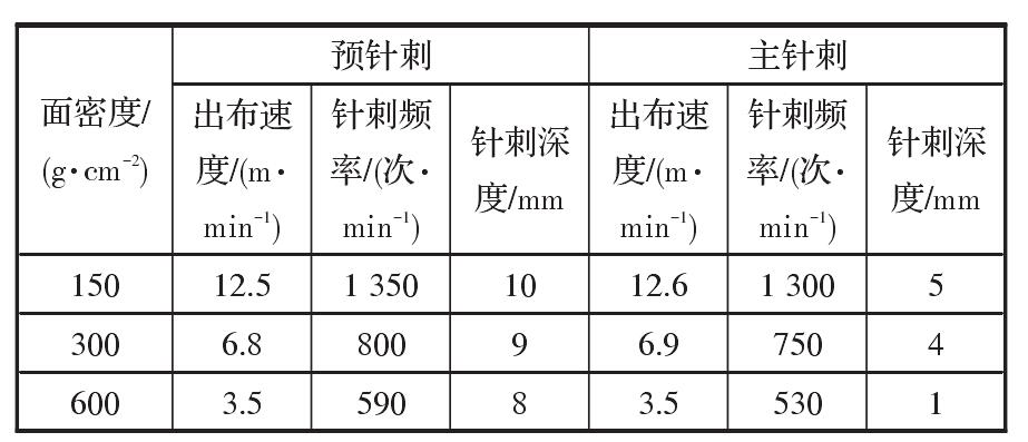 針刺頻率和針刺深度對布面強力有重要的影響。對于高強滌綸紡黏針刺土工布來講,布的面密度越大,生產速度越慢,針刺頻率越低;面密度偏小時,針刺工藝正好相反。針刺深度調整原則如下:①單絲強力較高時,針刺深度深一些;②面密度較大時,針刺深度淺一些;③預針刺深度比主針刺深一些。